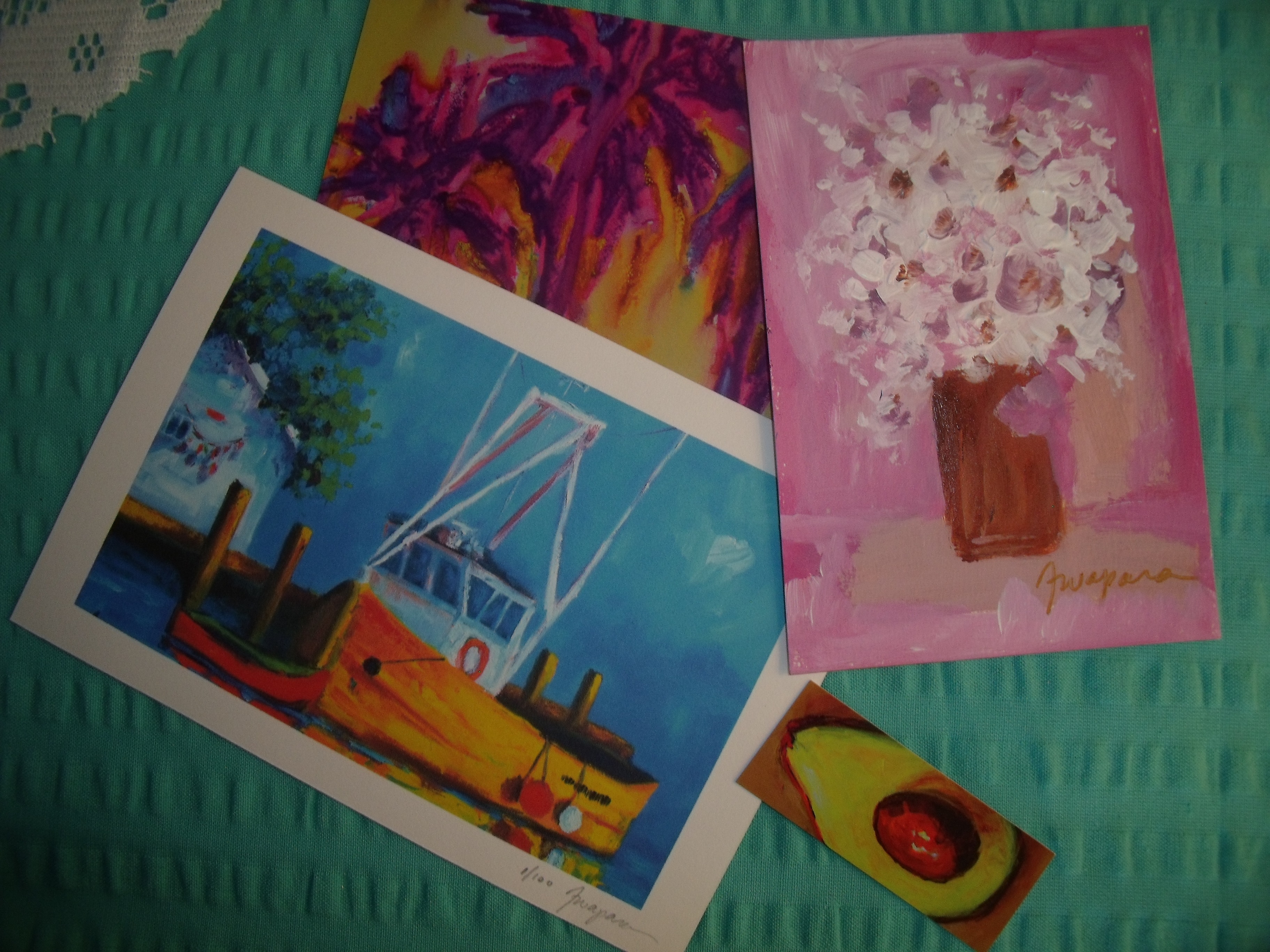 This delightful collection comes courtesy of Patricia Awapara, a most delightful and talented artist and blogger friend from Miami Florida, US of A! We did a swap and once again I feel I got the better part of the bargain! I love the original of the boat painting and Pati kindly made a copy for me. That was all I was expecting and would have been thrilled to receive. But – I also received a small original! The flower vase is an original Patricia Awapara 🙂 And a postcard and a tiny print of the so cute half avocado……. Aren’t they gorgeous?