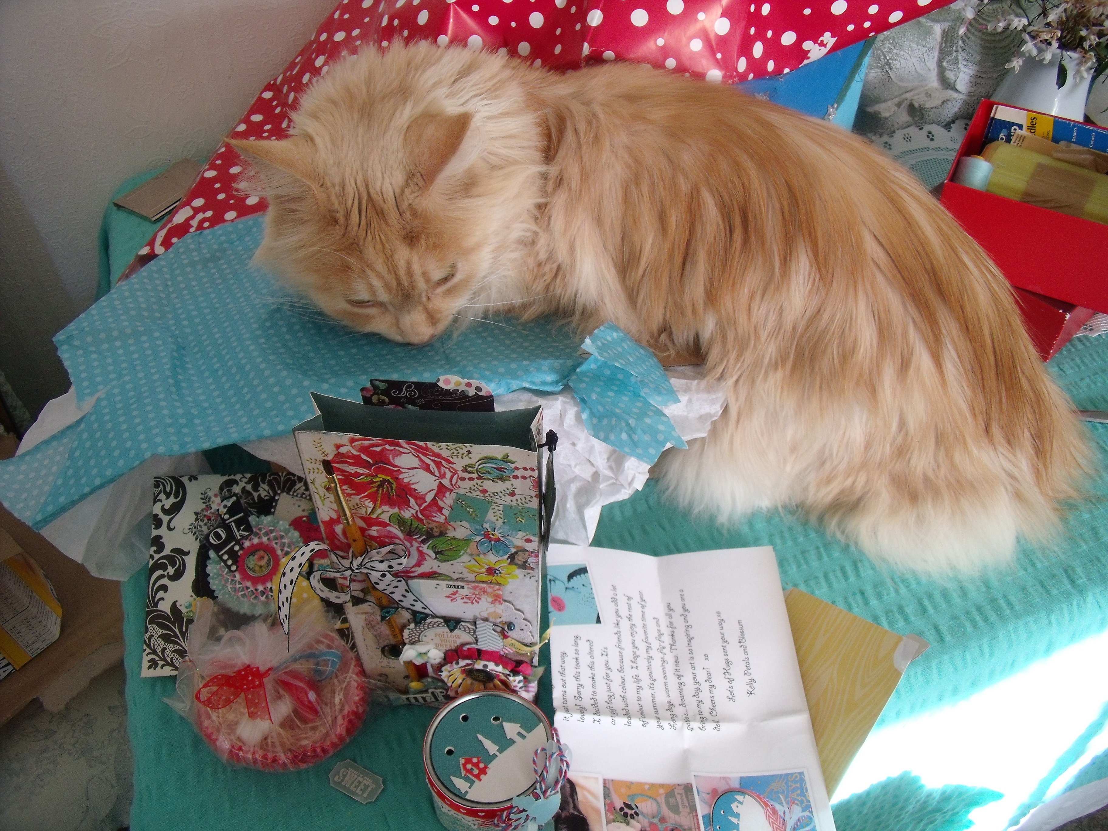 I know I have to post sometime-lol. I LOVE YOUR CAT!!! He is beautiful, comical + pretty darn smart. Your package is so special + reading through all your lovely creative friends was fun! You all have such a kinship + what great friendships through your “happy” packages!!! Mail is still fun like when we were kids. Great post + enjoyed the cat adventures!