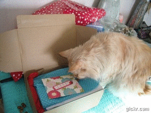 I laughed with glee at all your GIFS. Orlando in action! Weeeeeee 😀 Especially rubbing up to the box and the very first one when O looks right at momma and her crazy camera. Sorry about it being sealed up like Fort Knox, HA. I thought it would be handled by so many people, and then of course there’s the guy in the canoe…LOL. It was so long since I sent it, I almost forgot what was in there, snort. I have one other little thing, it was held back for colder weather…I will soon post. 😀