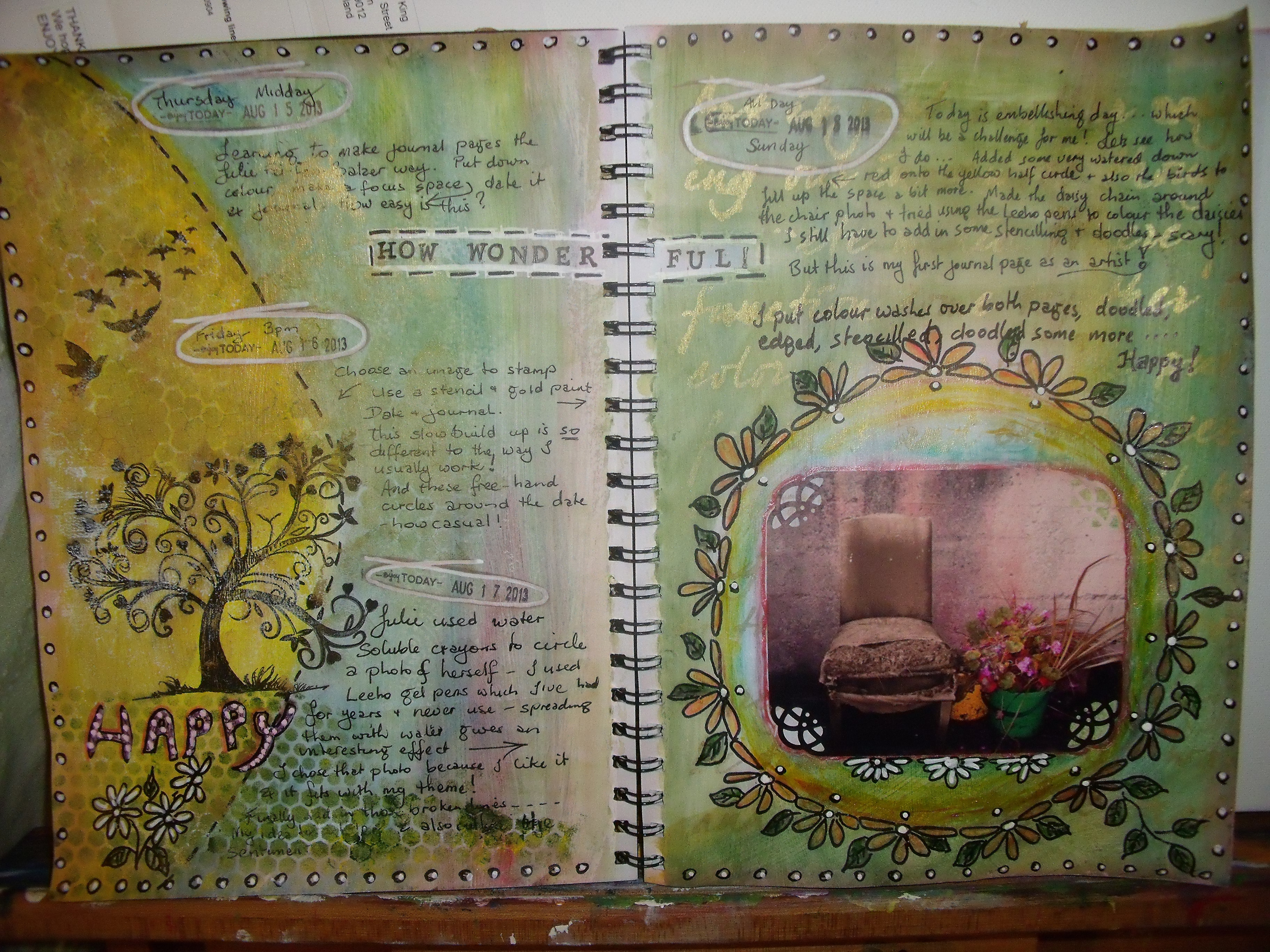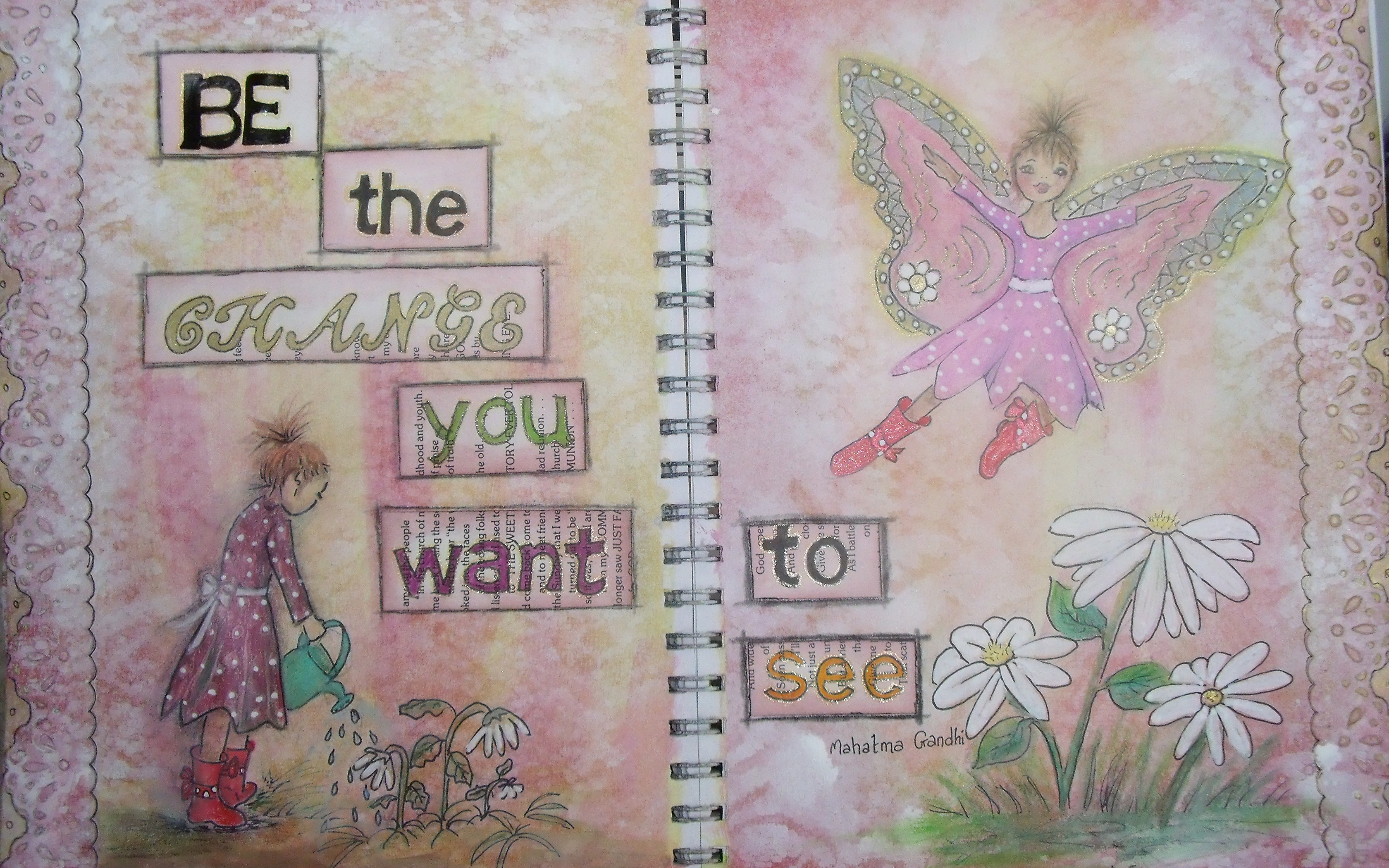Painted over black gesso across two pages, with stencils and modelling paste leaves and stars. The little verse bottom left made itself known as I finished – it’s a bit Roald Dahl-esque don’t you think? I’m dedicating it to Tericia McGowan – enjoy!