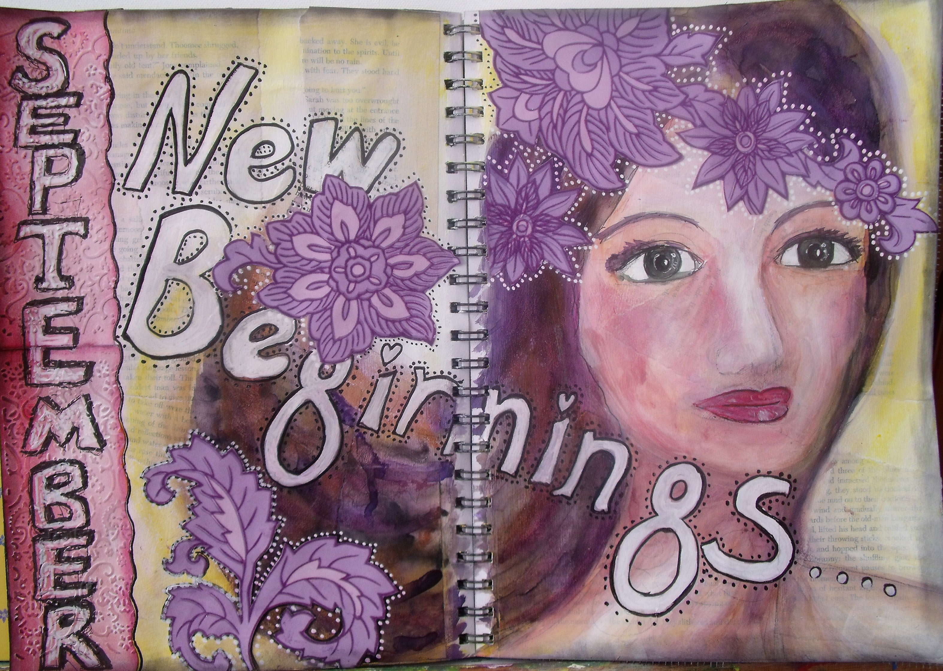 But this first effort is pretty dismal! Usually when I make a muck up I can retrieve, cover, change, somehow redeem something – but there is nothing on this page I like. The background is flat and uninspiring and I over-doodled on the right hand edge. The splodges of gold are an aborted attempt to stencil some leaves with gold perfect pearls – which is a brilliant thing to do provided you don’t blast them over enthusiastically with the very large water spritzer bottle picked up mistakenly because you weren’t really concentrating at that particular moment, and thusly cause them to just go glump!