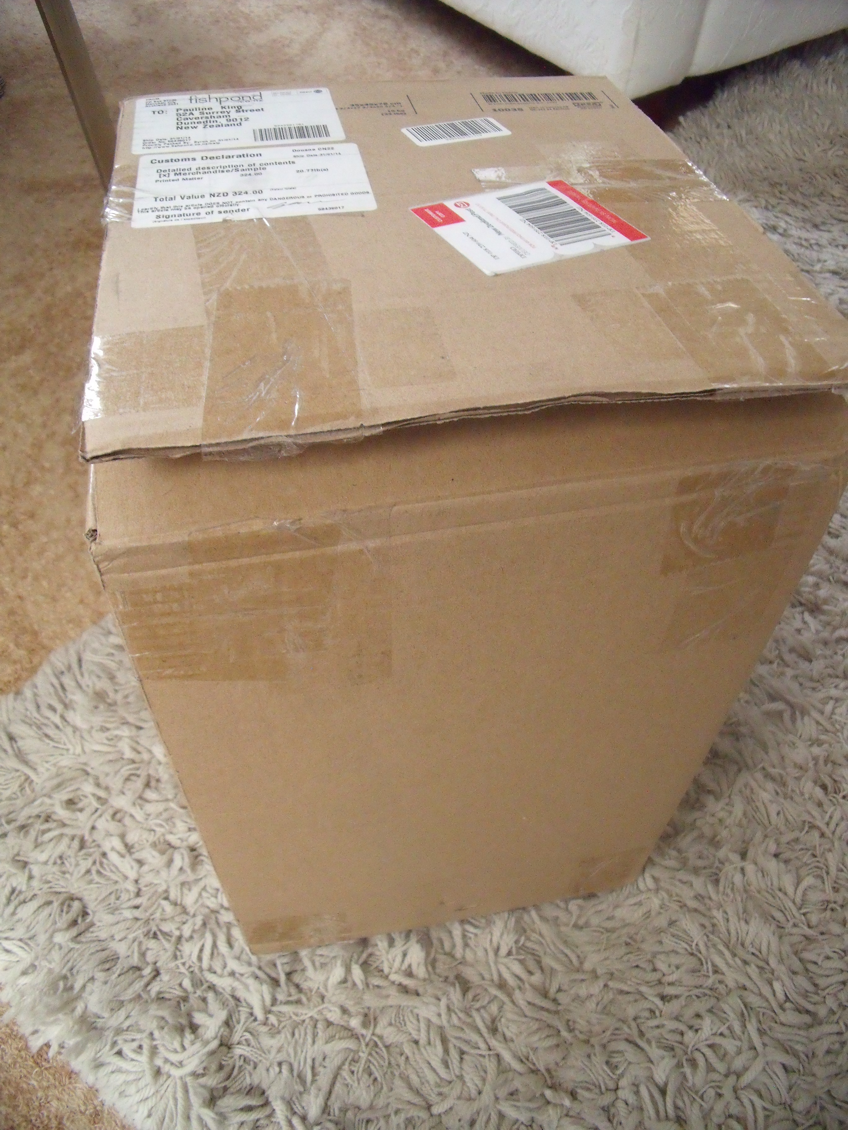 Here is a picture of the box, newly emptied of it’s goodies, proudly posing beside Orlando’s metre high wardrobe cat: