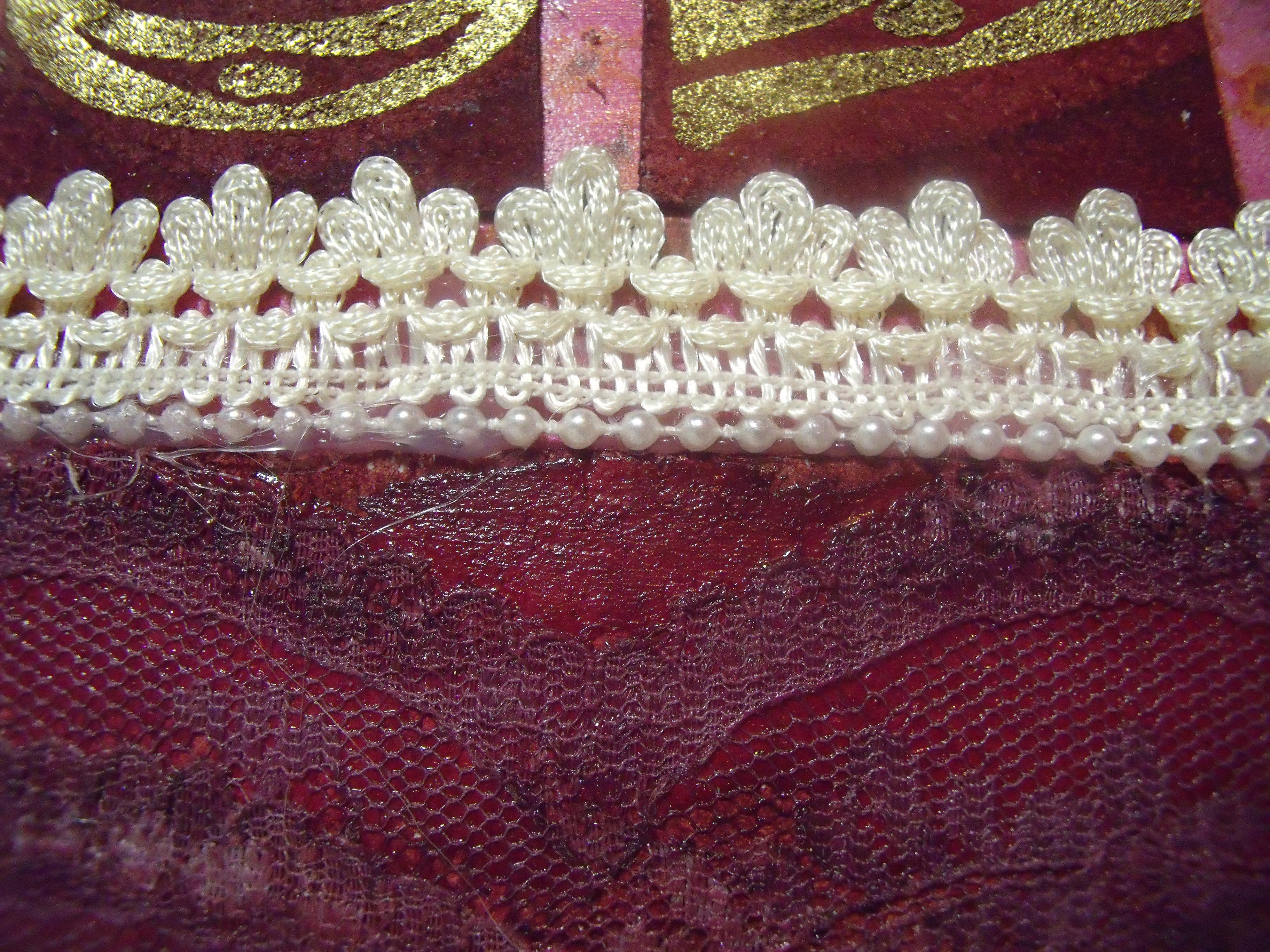 Lace was hot glued all around the top edges and red organza ribbon employed for the handles