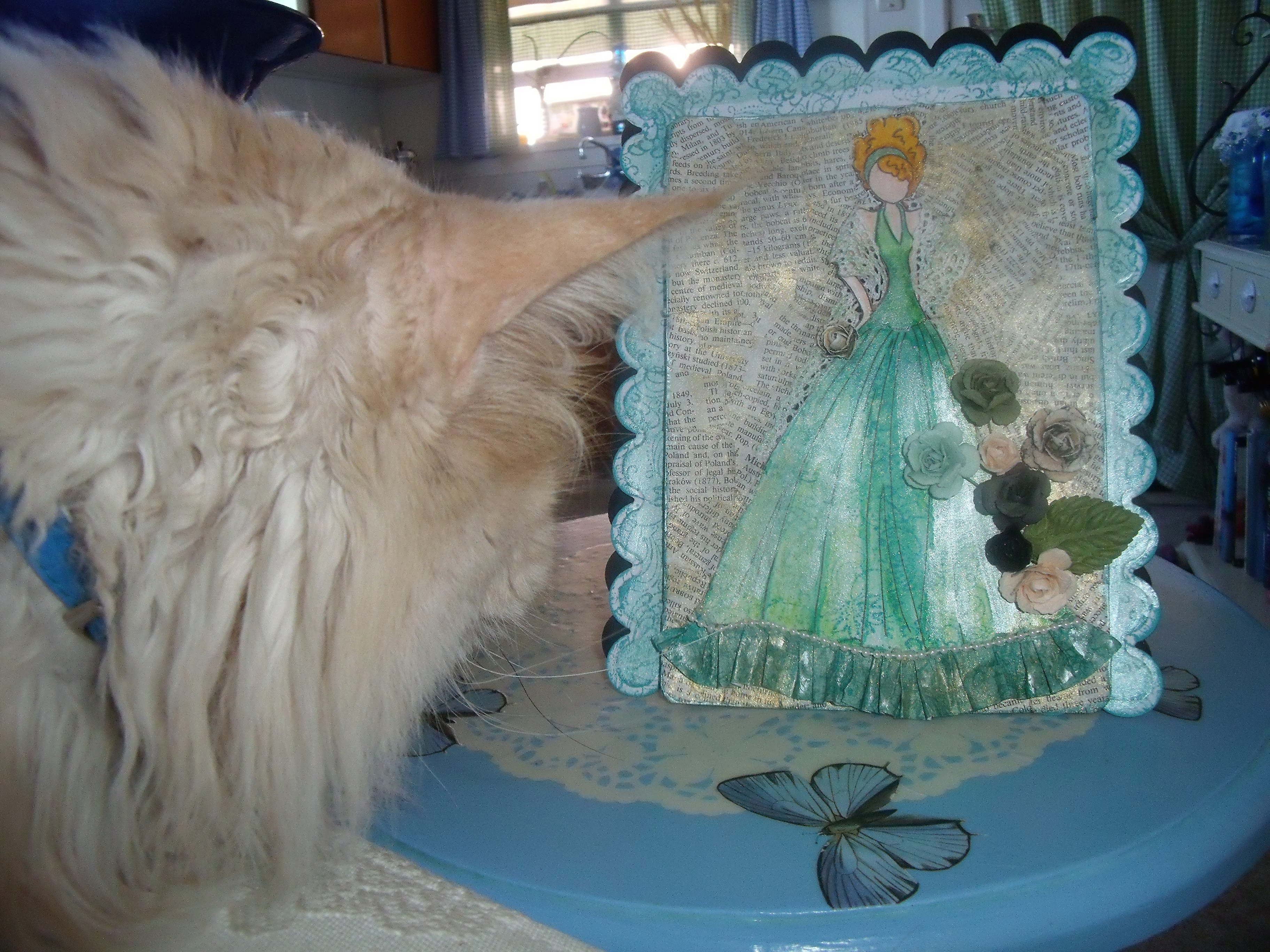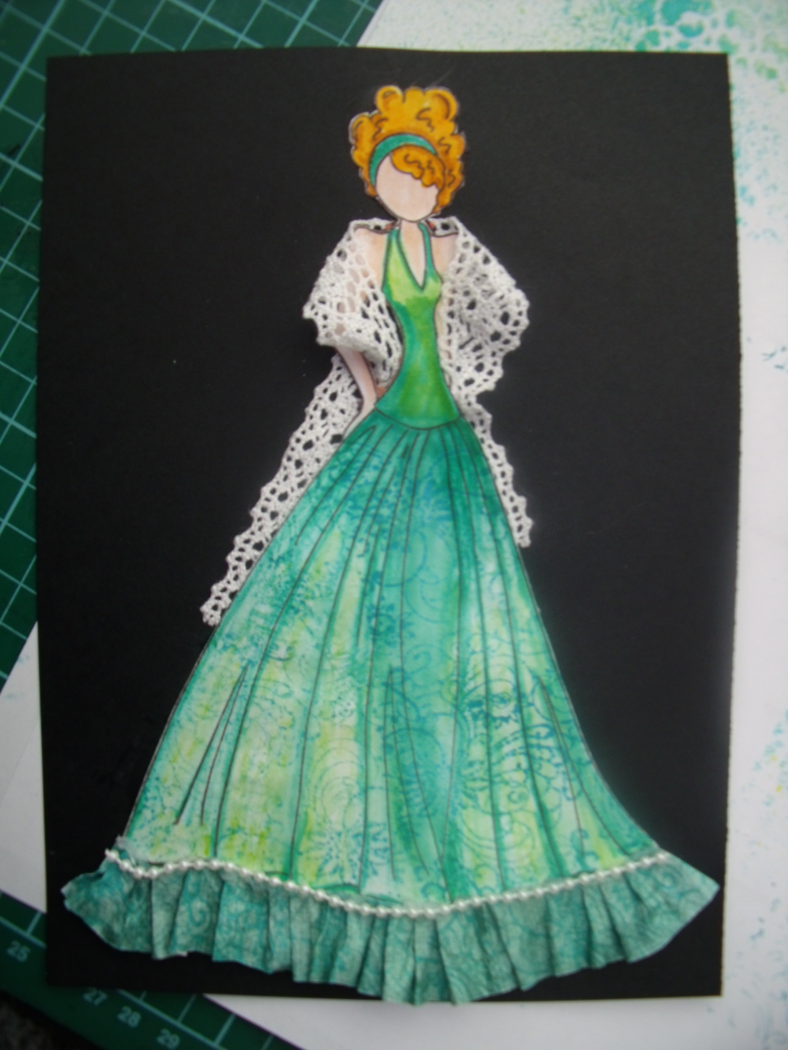Using white, black and gold pens I highlighted the edges of the cut outs, faux stitched outside the edges and outlined different aspects of the woman.