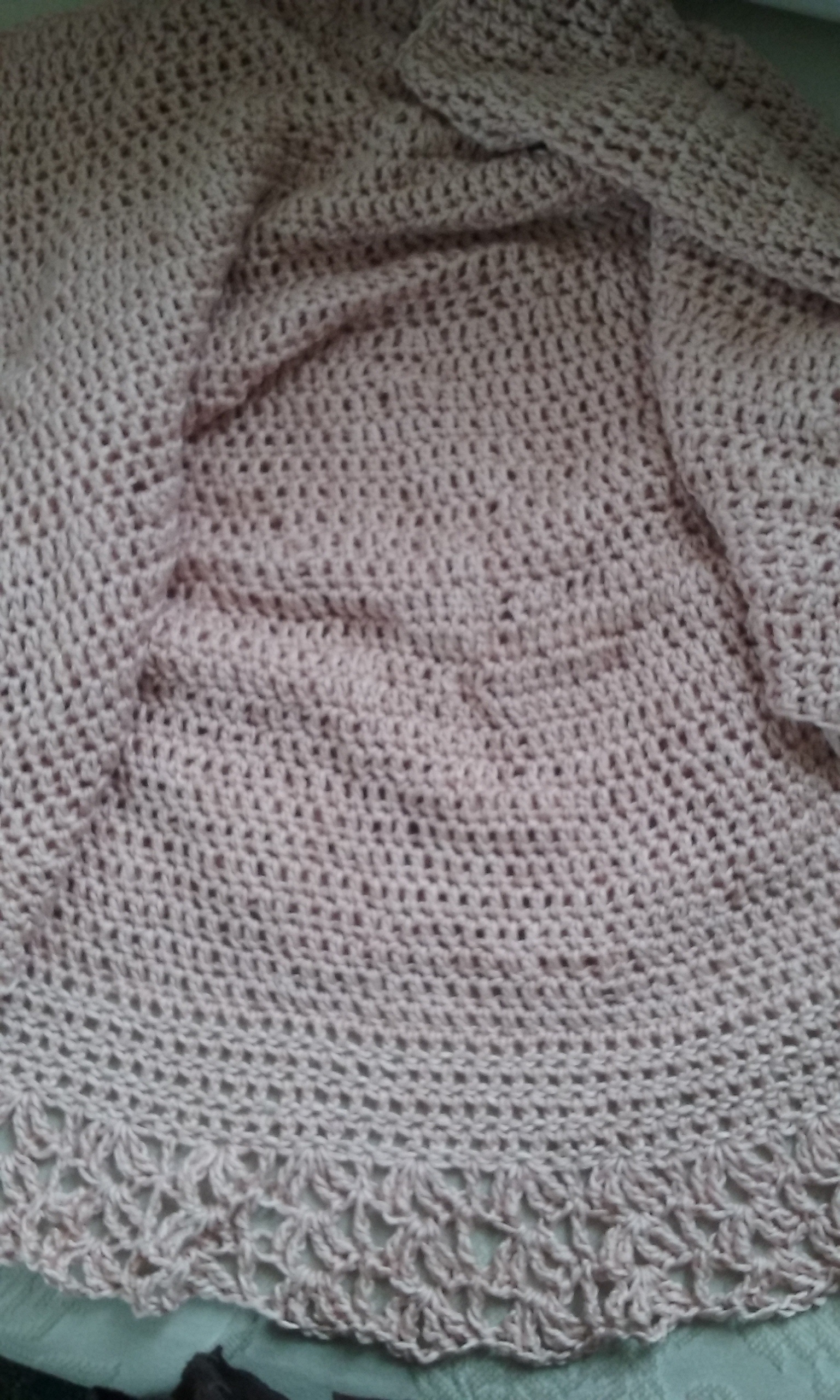 This is crocheted, adapted from an original pattern consisting of lots of little hexagons all stitched together in long panels. Made from Lion Brand ‘Shawl in a Ball’ I used three different colour ways all featuring my favourite colour. The back neck requires building up a bit – I might even do that this evening.