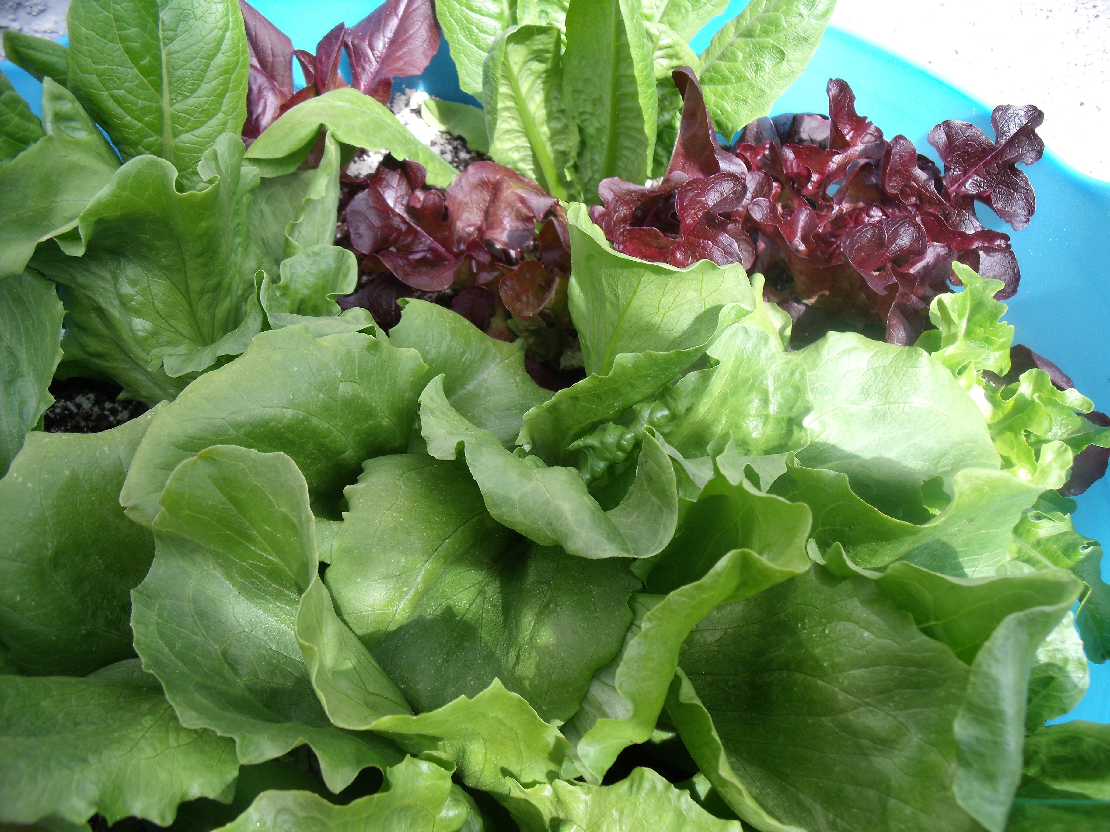 Lettuce, arugula, silver beet [chard] various herbs and tomatoes