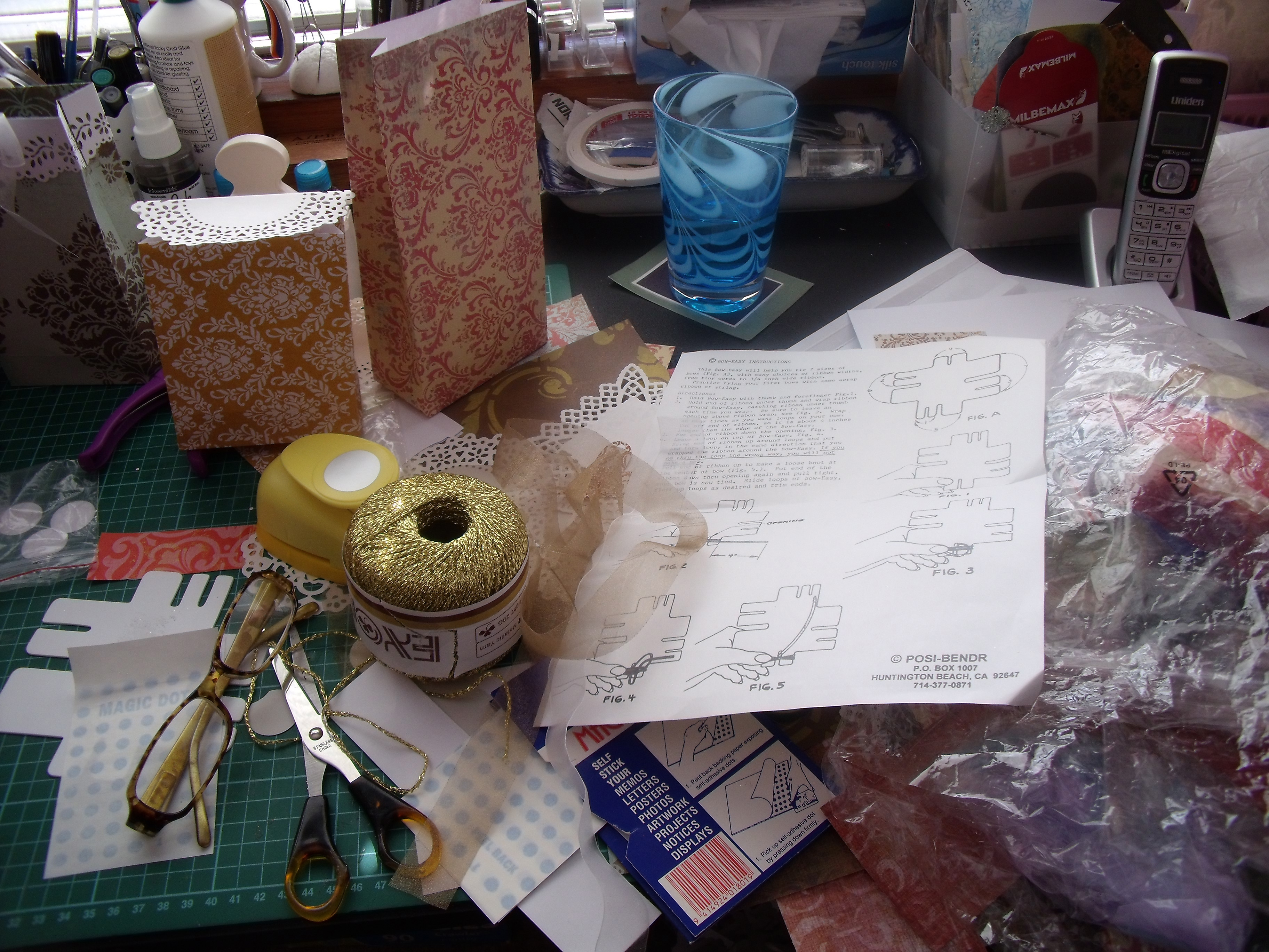 I remembered having seen a picture on Pinterest of some newsprint bags with doilies, and I set about making my own version. Here they are all waiting about on the other work bench for whatever happens to them next: