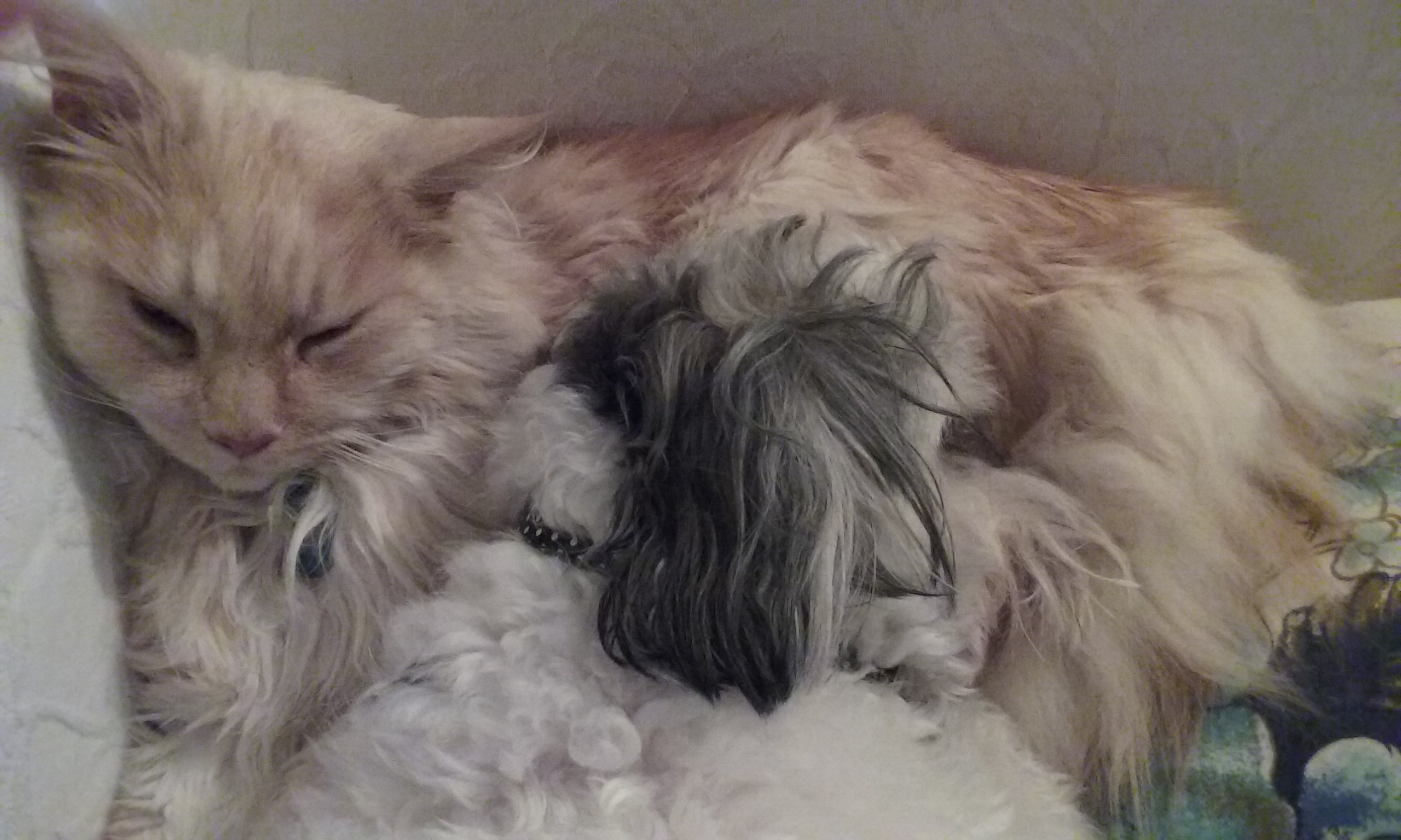 This is a recent photo, taken one evening on the sofa – Orlando is being cuddled with – not sure if he is enjoying it …….. but he stayed. Siddy was exhausted after a busy day and his mumma wasn’t sitting still, so the kitty had to do.
