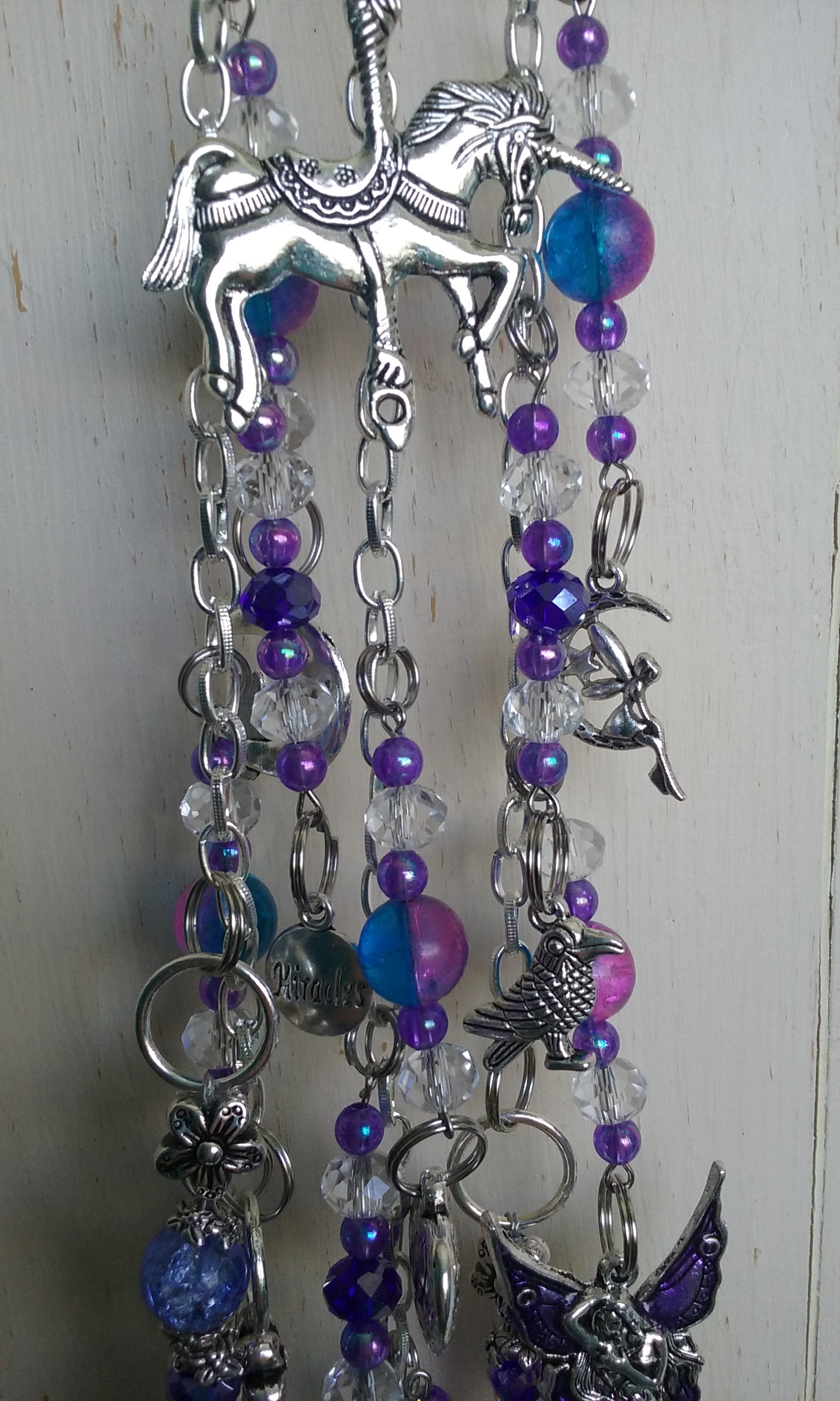 Almost immediately Don McLean began singing in my head. ‘Starry, starry night, paint your palette blue and grey …………’ and then I began musing on starry nights and dreams and wishes. the beads grew and the strands multiplied beneath my fingers as my mind wandered through wishes and dreams and the magic of the night that grants those wishes and dreams……………..charms began to appear dangling from the charm strands – a unicorn, a fairy, an angel sitting in the moon. Harbingers of dreams coming true were placed, a bell, a crow, the word ‘miracles’, a heart, young lovers………….