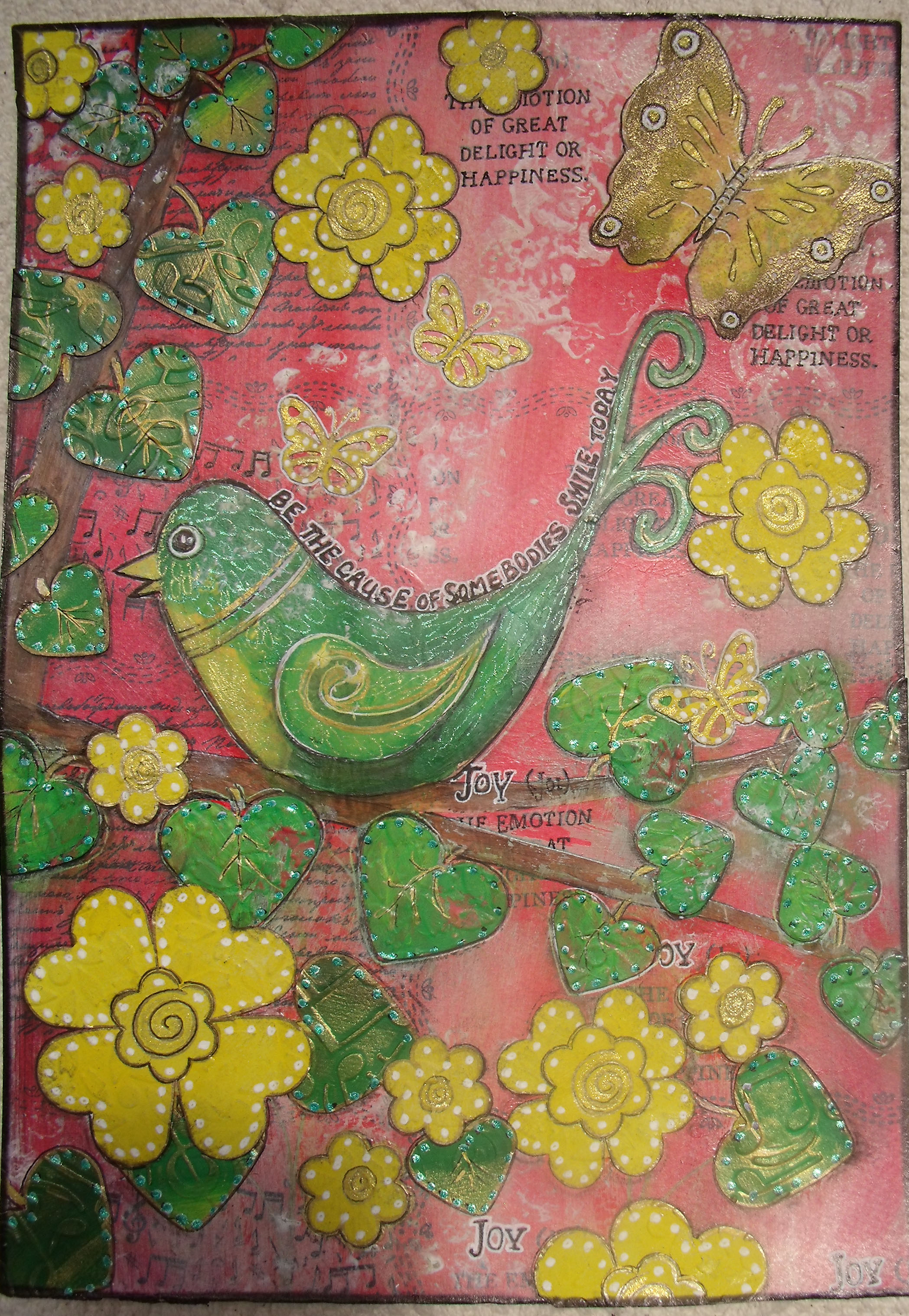 I love my little birdie, I hate the composition! It’s messy and crowded and the bird is in the wrong place ………… I really need to develop a plan of action before I start drawing and painting and gluing random bits down ……. so much to learn!! 🙂