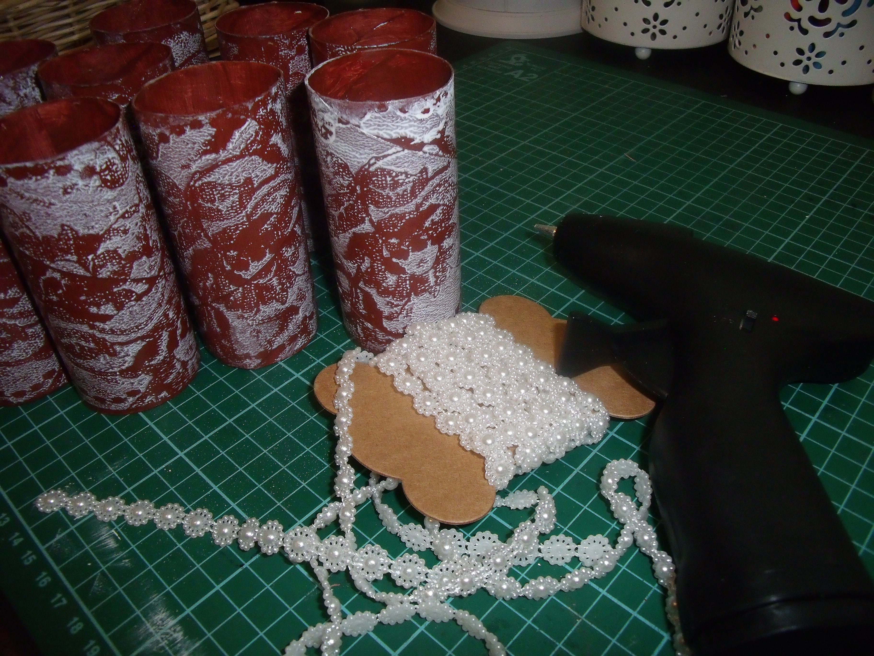 Lace was hot glued all around the top edges and red organza ribbon employed for the handles