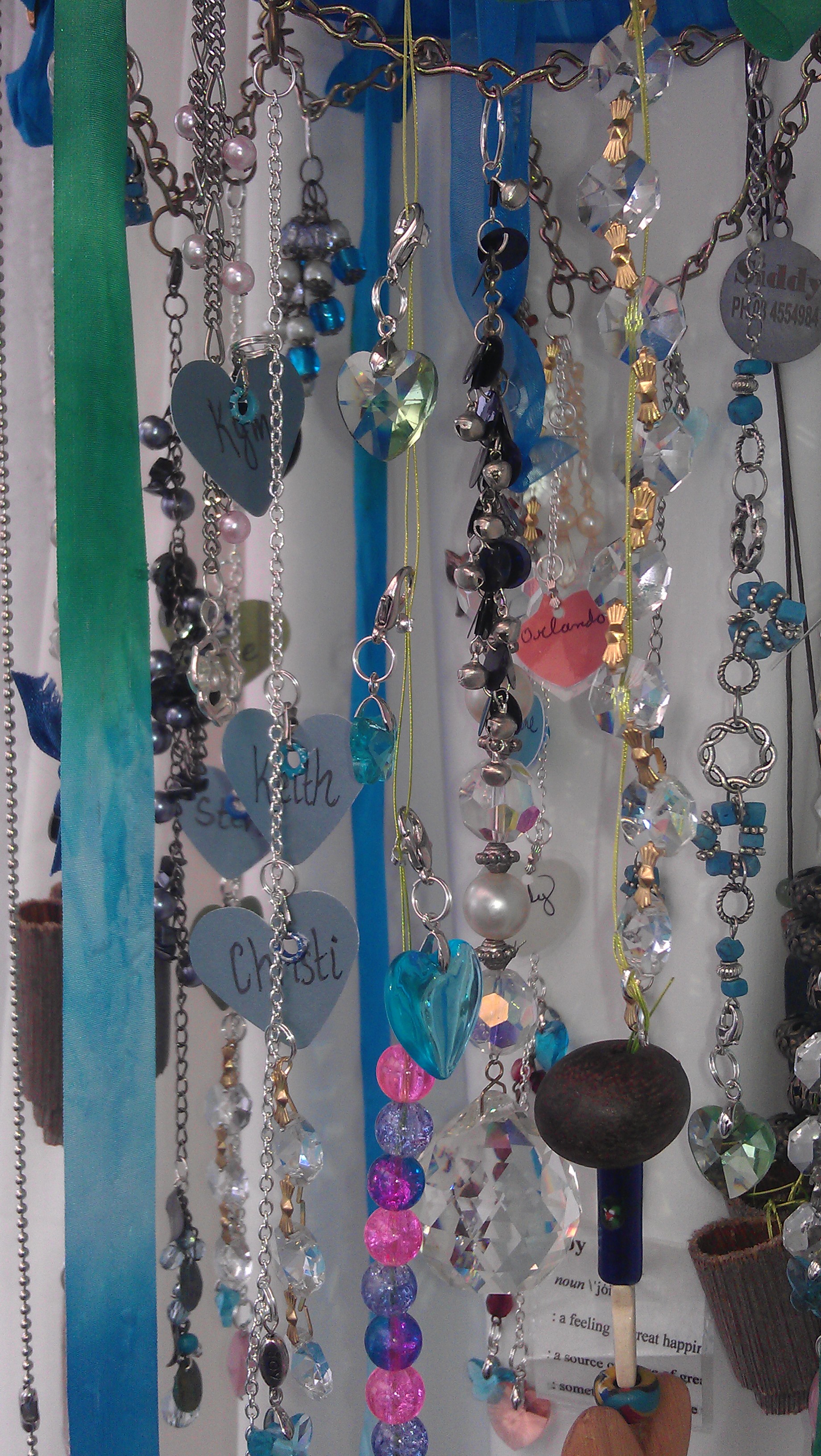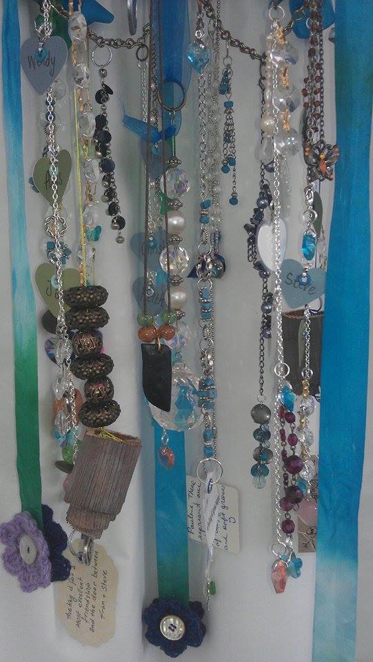 The gifts sat on a tray in my art room, a vastly different array of items, from tiny glass beads to big wooden beads, threads of broken jewelry, ribbons, glass hearts, buttons, crochet flowers, palm frond spirals, lengths of ribbon, hearts with names on and a guitar pic. All mixed in with my collection of broken sun catchers and glass hearts, flowers and chandelier chains. There is such a huge variety of items I was quite bedazzled by them and I had no idea where to begin.