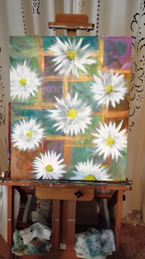 The daisies are important so I just kept on playing with colour and form and light and shade, building them up…….. I often don’t know when to stop and almost a whole day went past……